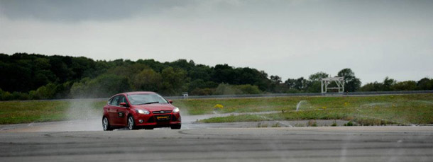 La zone d'essai sur sol mouillé comprenait une portion de piste sinueuse permettant d'observer la réaction des pneumatiques aux changements de direction à haute vitesse, aux freinages d'urgence et l'équilibre du véhicule. Un second test, réalisé sur un cercle à rayon constant simulant un grand rond-point britannique par temps typiquement britannique (pluie !), nous a permis de mesurer la vitesse en virage et la réactivité de la voiture aux sollicitations du volant à la limite d'adhérence.