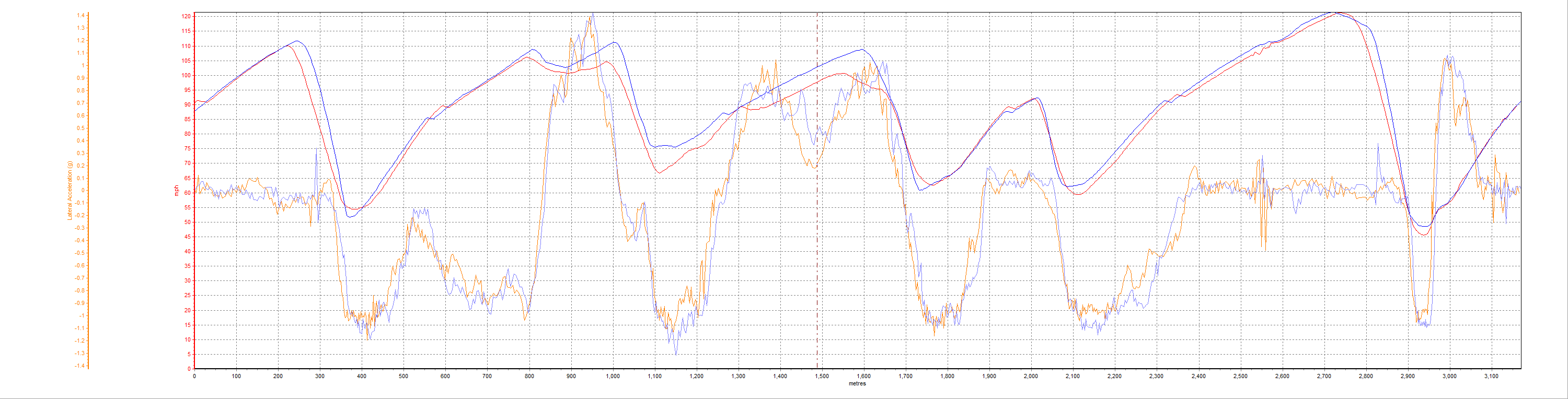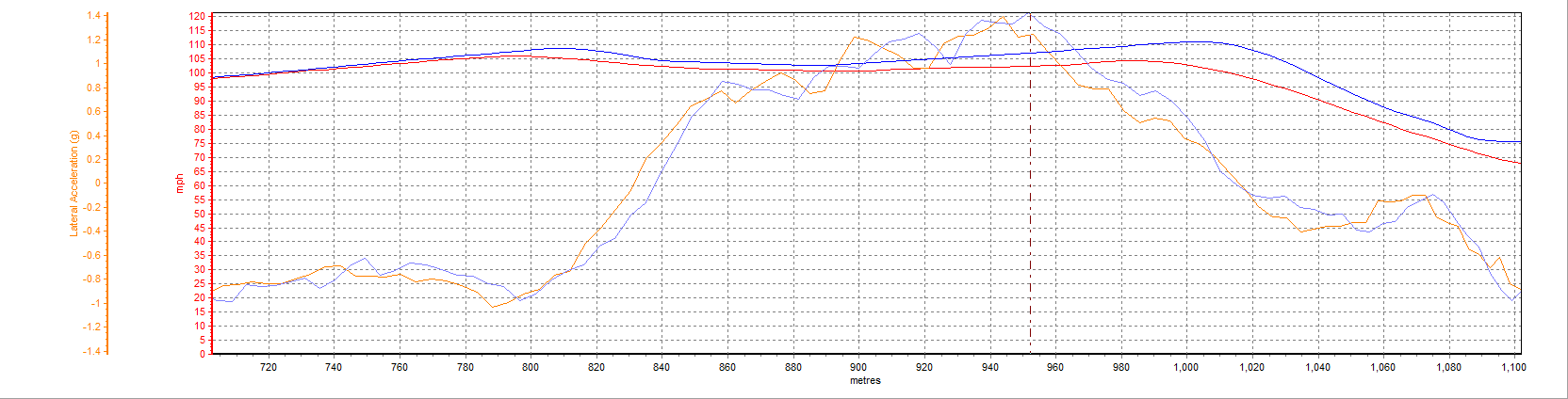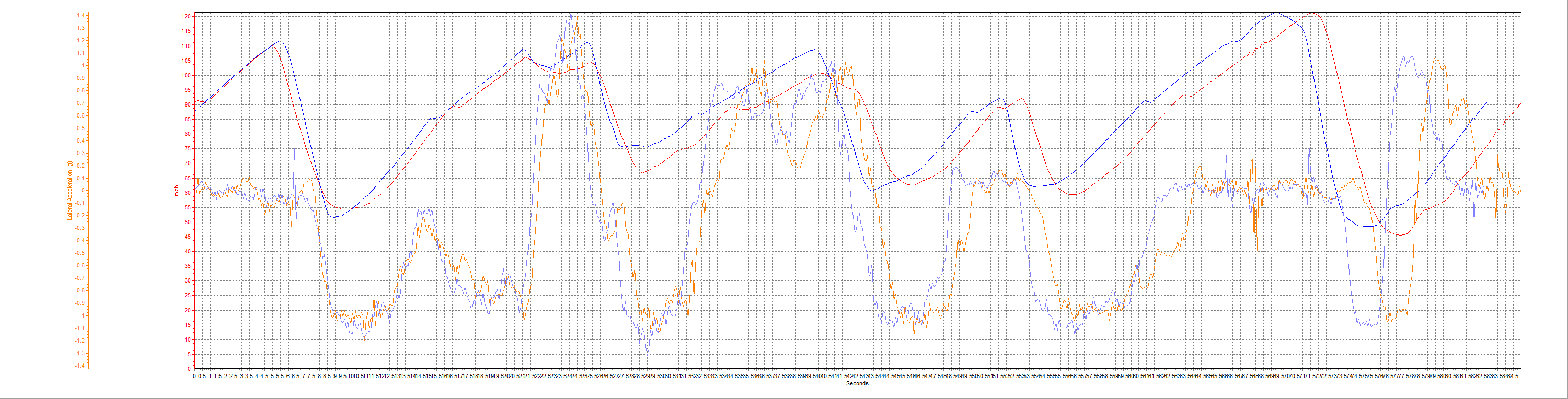 Cliquez pour afficher les images en taille réelle. La ligne bleue représente le pneu piste Kumho V70a et la ligne rouge le pneu route Toyo T1R. La plupart des graphiques incluent une courbe d'accélération latérale.