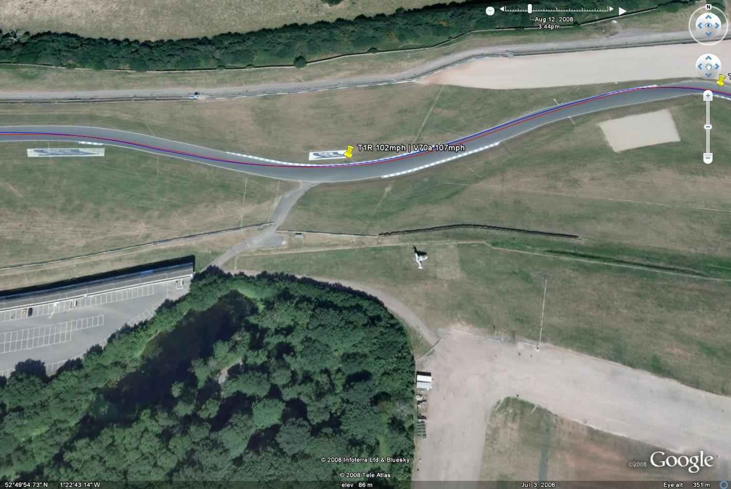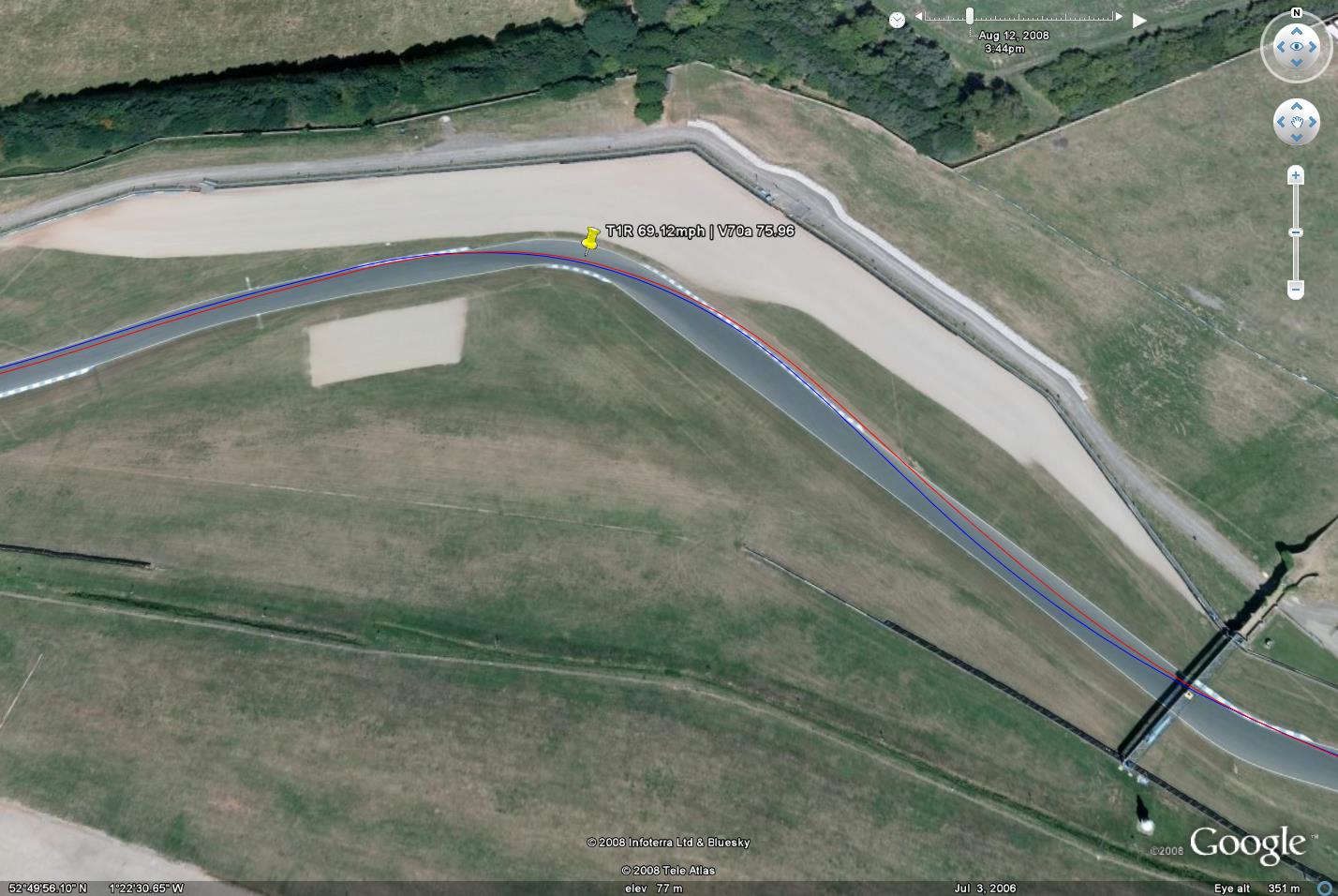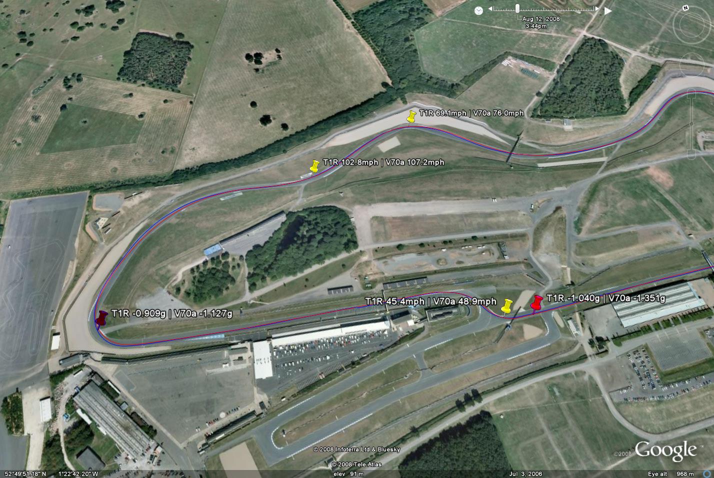 Cliquez pour afficher les images en taille réelle. La ligne bleue représente le pneu piste Kumho V70a et la ligne rouge le pneu route Toyo T1R. La plupart des graphiques incluent une courbe d'accélération latérale.
